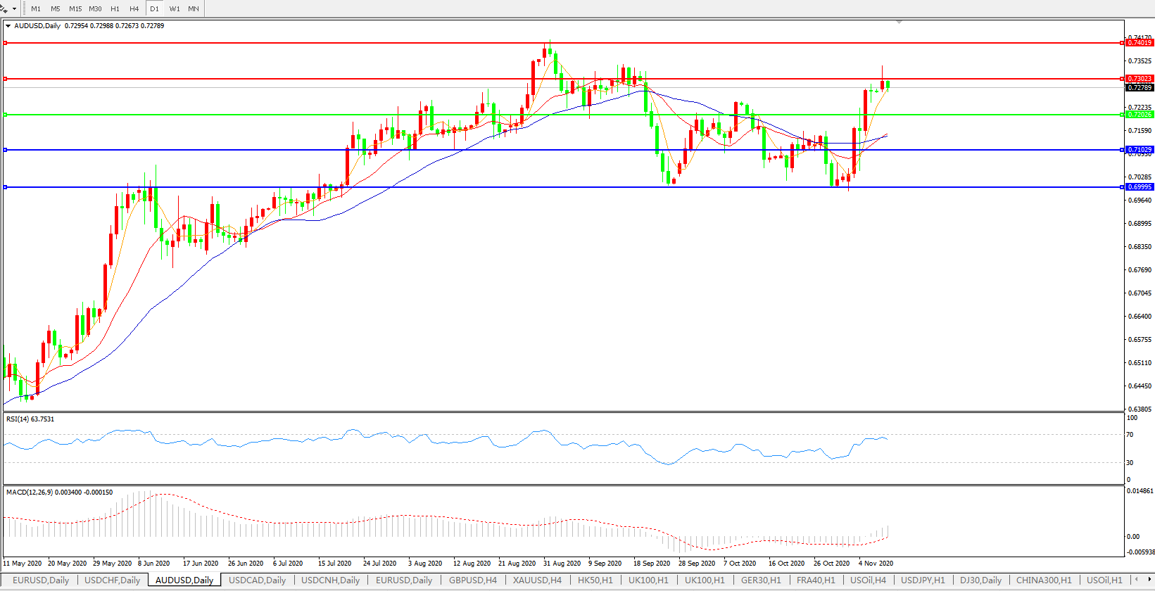 澳元兑美元周一刷新七周高点至0.7300,为9月21日以来的最高水平,因投资者认为稳定性更强的拜登政府会促进全球商贸,从而买入对贸易曝险较大的货币。澳元升至0.7297,而澳元上周一刚刚触及15周低点0.6991美元。 澳新货币最近几周走软,因两国央行暗示进一步宽松货币政策以帮助经济走出新冠疫情。但这种情况上周反转,因为市场开始押注拜登赢得大选,共和党控制参议院--这料将刺激美联储进一步放宽货币政策。Blackrock Investment Institute在报告中写道,“民主党赢得大选,但没能掌控参议院,将强化追求收益和成长类股这样的市场趋势。拜登政府与国会形不成统一意见,可能影响财政刺激,限制债券收益率和通胀预期的上升。” 投资者将关注新西兰央行,该央行料将在周三维持政策利率不变。 款。”此外,一份市场调查预期新西兰央行到明年年初会开始降息到负利率。