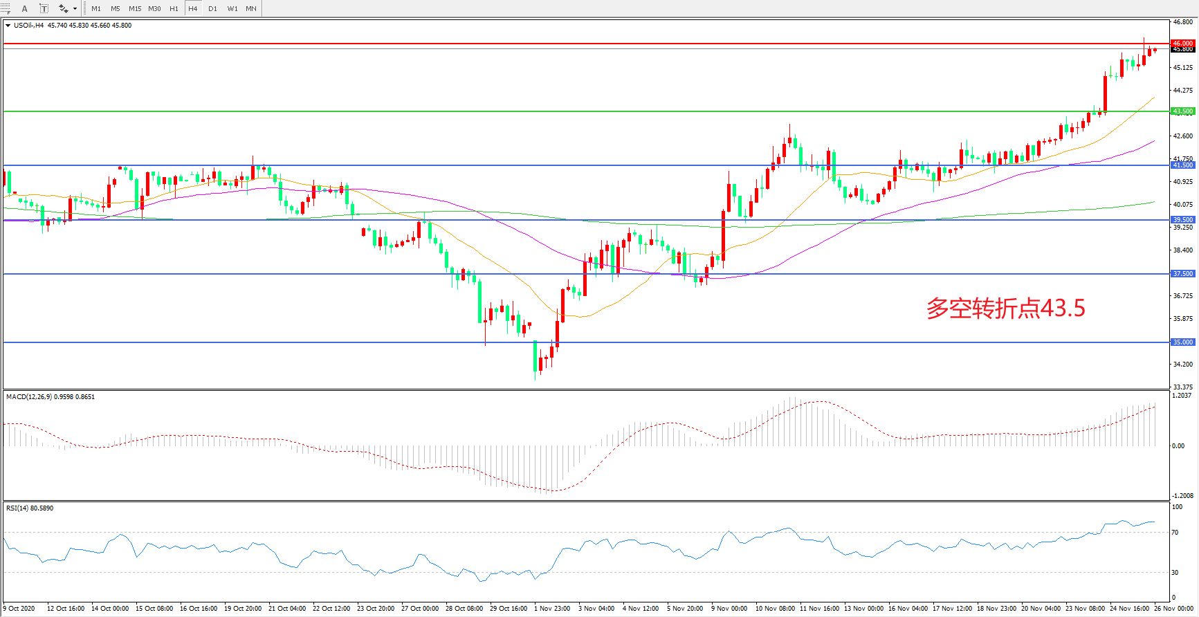 周三(11月25日),OPEC表态将会延后三个月增产,给了多头极大的信心,美国WTI原油继续高歌猛进,收报45.82美元/桶。目前以沙特和俄罗斯为首的OPEC+仍倾向于将现有减产协议维持到明年一季度,与此同时,OPEC开始担心高油价下的市场份额被美国页岩油抢夺,新的举措可能会在下周举行的OPEC+部长级会议时揭晓。