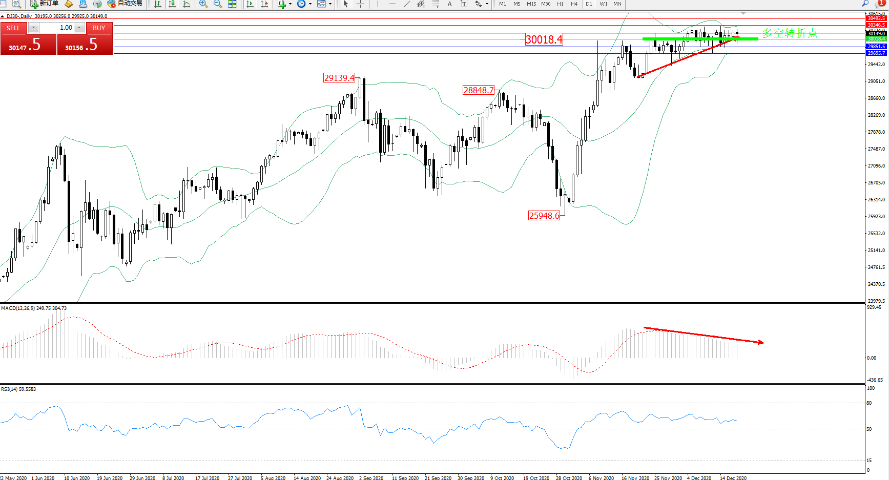 道琼斯指数12月18日(周五)收盘下跌124.30点,跌幅0.41%,报30179.05点。美股三大指数集体下跌,之前共和党的要求导致国会未就联邦支出法案达成协议。美国众议院拨款委员会主席洛伊提出临时拨款法案,以维持政府运作到周日,美国众议院拨款委员会表示,众议院全体议员预计将在周五晚上审议该法案。在美国经济刺激计划谈判拖延之际,民主党当选总统拜登即将上任的首席经济顾问周五表示,国会正在谈判的新冠病毒救助计划不应包括限制财政部和美国联邦储备理事会(FED/美联储)抗击经济危机能力的条款。“在我们应对一场前所未有的经济危机之际,保持美联储快速有力的应对能力,符合美国人民的利益,”将在拜登政府担任白宫国家经济委员会主任的Brian Deese在一份声明中表示。