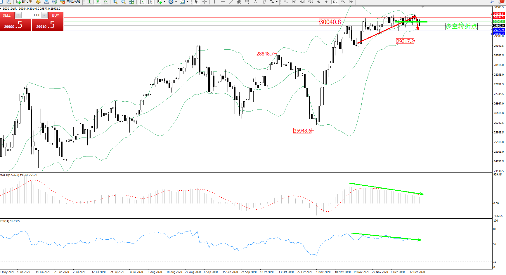 道琼斯指数12月22日(周二)收盘下跌200.90点,跌幅0.67%,报30015.51点。美股收盘,三大指数涨跌不一,美国三季度GDP数据终值获小幅上修,但市场反响暂时有限,在年底将至之际,市场早有把目光修投向了2021年的经济前景,对于疫苗的乐观情绪却与近期美欧各国疫情加速爆发的场景构成鲜明反差,令投资者仍然陷入左右为难,这也令美元指数暂时缺乏进一步反弹上攻的动能。 市场仍在关注美国政局在年后的最终尘埃落定,以及之后更多补充财政措施的逐一出炉,而在此之前,年内最后两个交易周中,美元指数大概率将围绕90关口继续宽幅盘整,市场交投意兴阑珊之际,却仍需谨防突发消息事件对行情走势产生不成比例的影响。