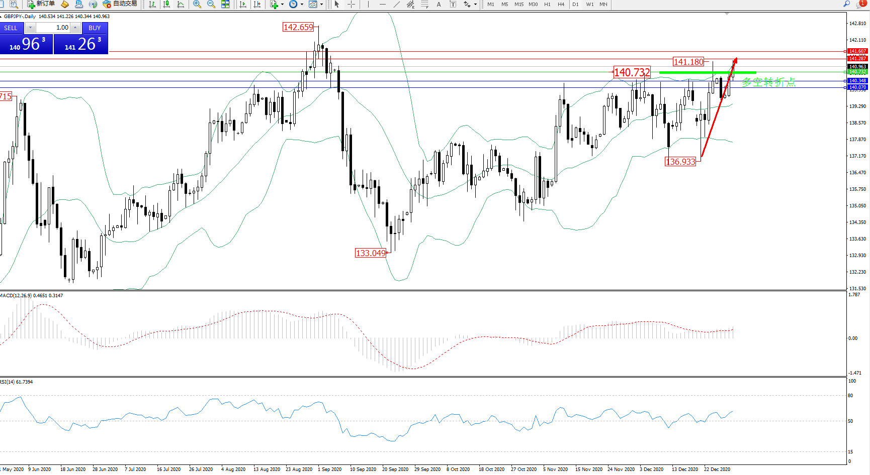 交易策略:140.732上方看涨,目标141.287、141.607