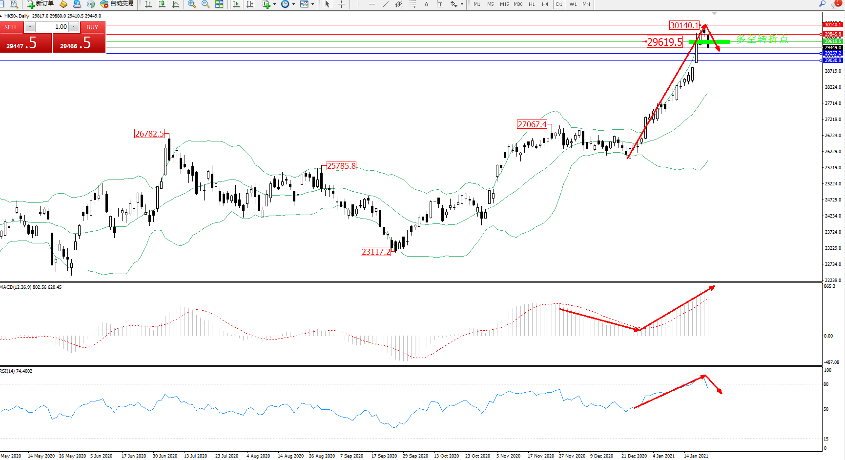 技术点评:多头动力延续布林带指标通道上轨附近持续震荡上扬态势良好,高位抵达30140位置后遇阻出现短暂回撤下行走势,布林带指标呈张口走势后开始有向上收口迹象,高位短期或将维持整理平移,MACD指标处于多头区域持续震荡上扬态势良好,RSI指标处于多头区域超买区80均衡线附近震荡后开始短暂回撤;