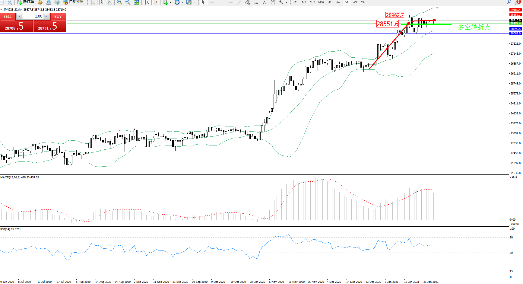 技术点评:多头动力延续布林带指标通道中上轨区间持续震荡上扬态势良好,高位抵达28962位置节点后遇阻出现短暂回撤,然度多头动力未见减弱走势,有继续拉升上扬态势,布林带指标呈收口向上移动走势持续中,MACD指标处于多头区域维持震荡拉升走势中,RSI指标处于50均衡线上方多头区域为吹整理平移中;