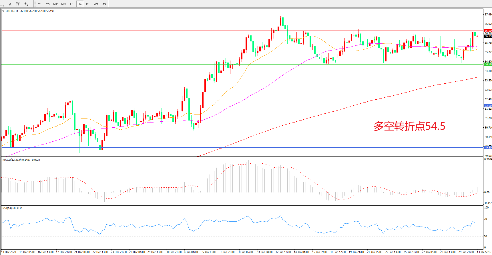交易策略: 在54.50之上看涨,目标56.50 60.00