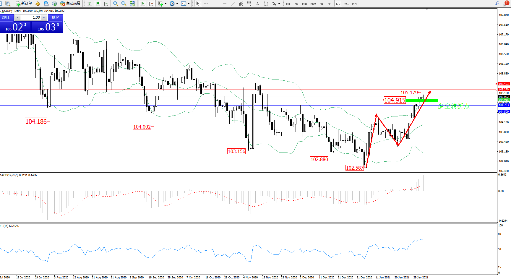 交易策略:104.915上方看涨,目标108.270、105.463