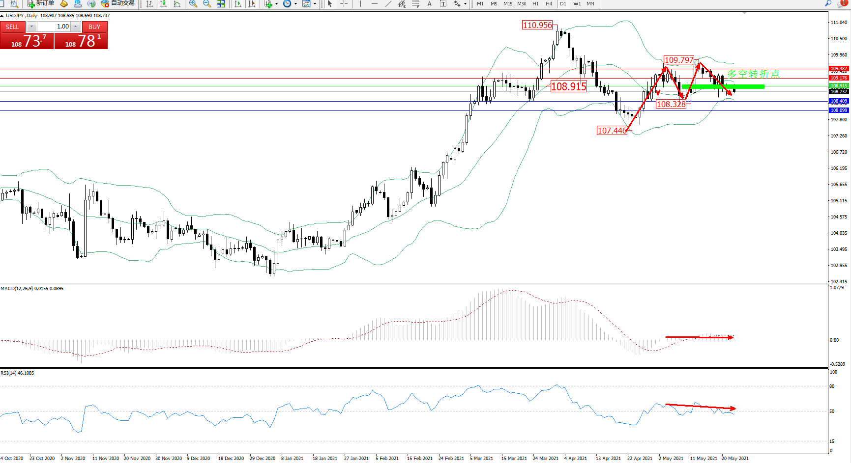 交易策略:108.915下方看跌,目标108.409、108.099