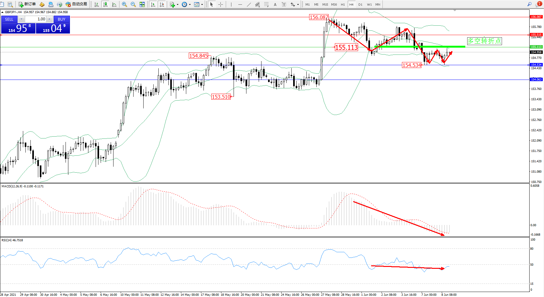 交易策略:155.113下方看跌,目标154.534、154.063