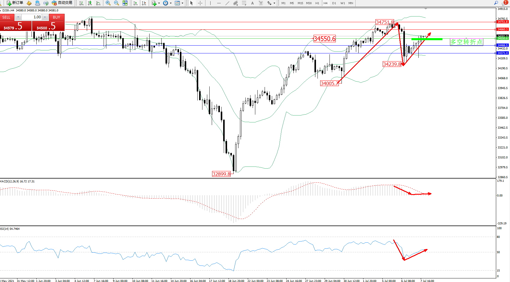 交易策略:34550上方看涨,目标34660、34751