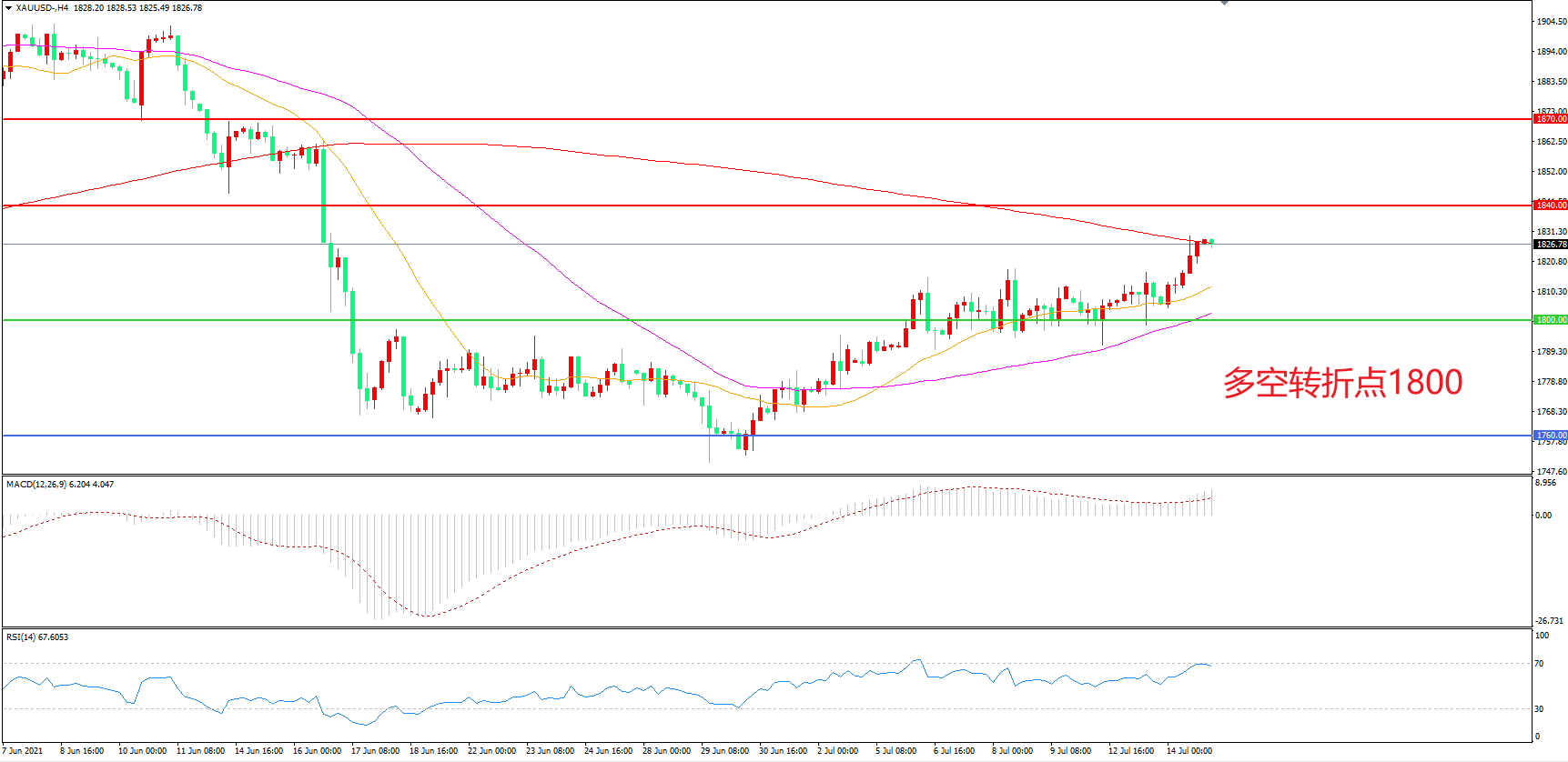 交易策略:  在1800.00之上看涨,目标1840.00         1870.00