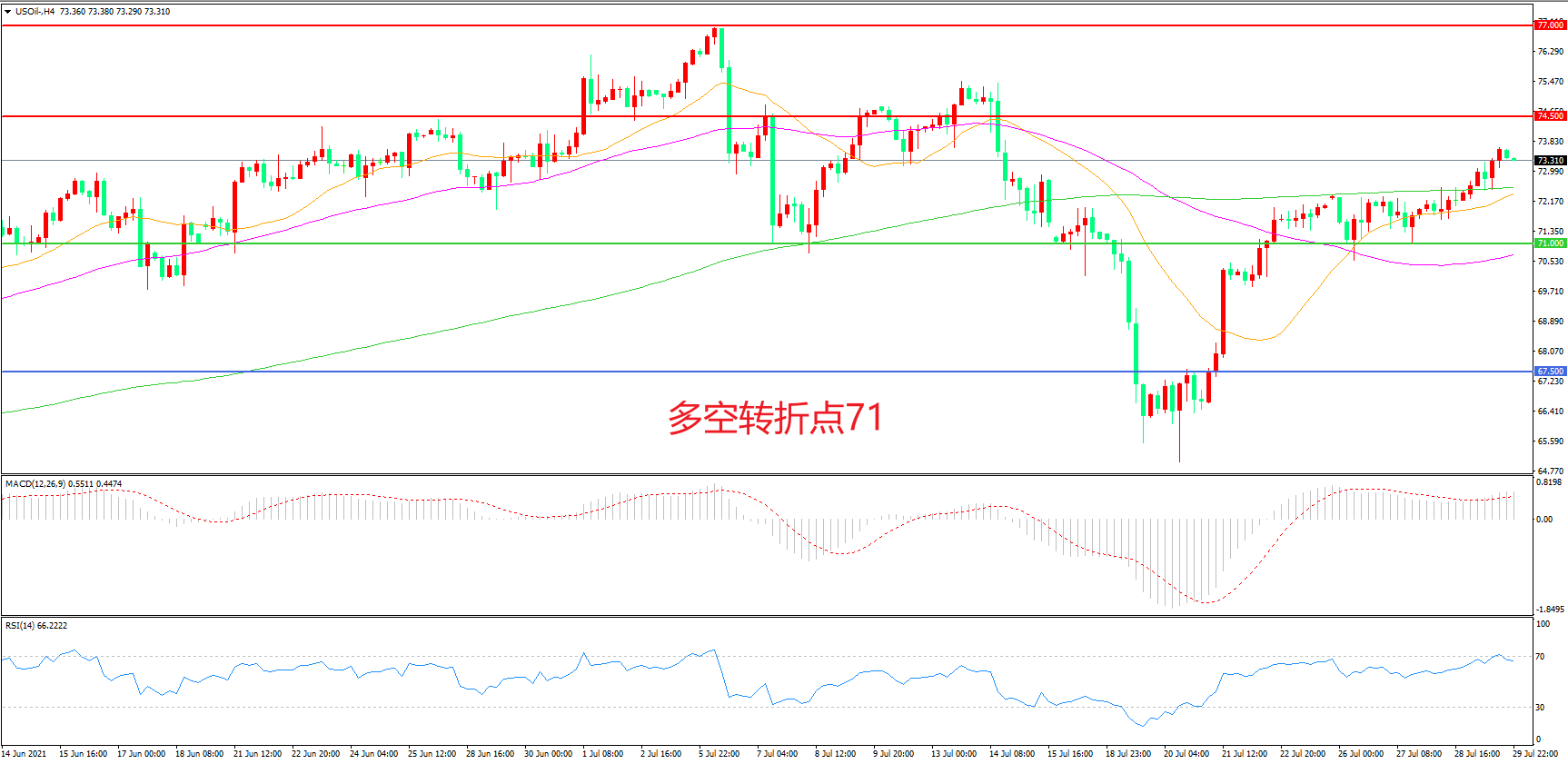4小时图看,油价突破200周期均线后震荡走高,整体表现有所回暖,71美元成为下方支撑,74.5美元成为上方阻力,MACD红柱增加,RSI指标走平,日内震荡上行概率较大。