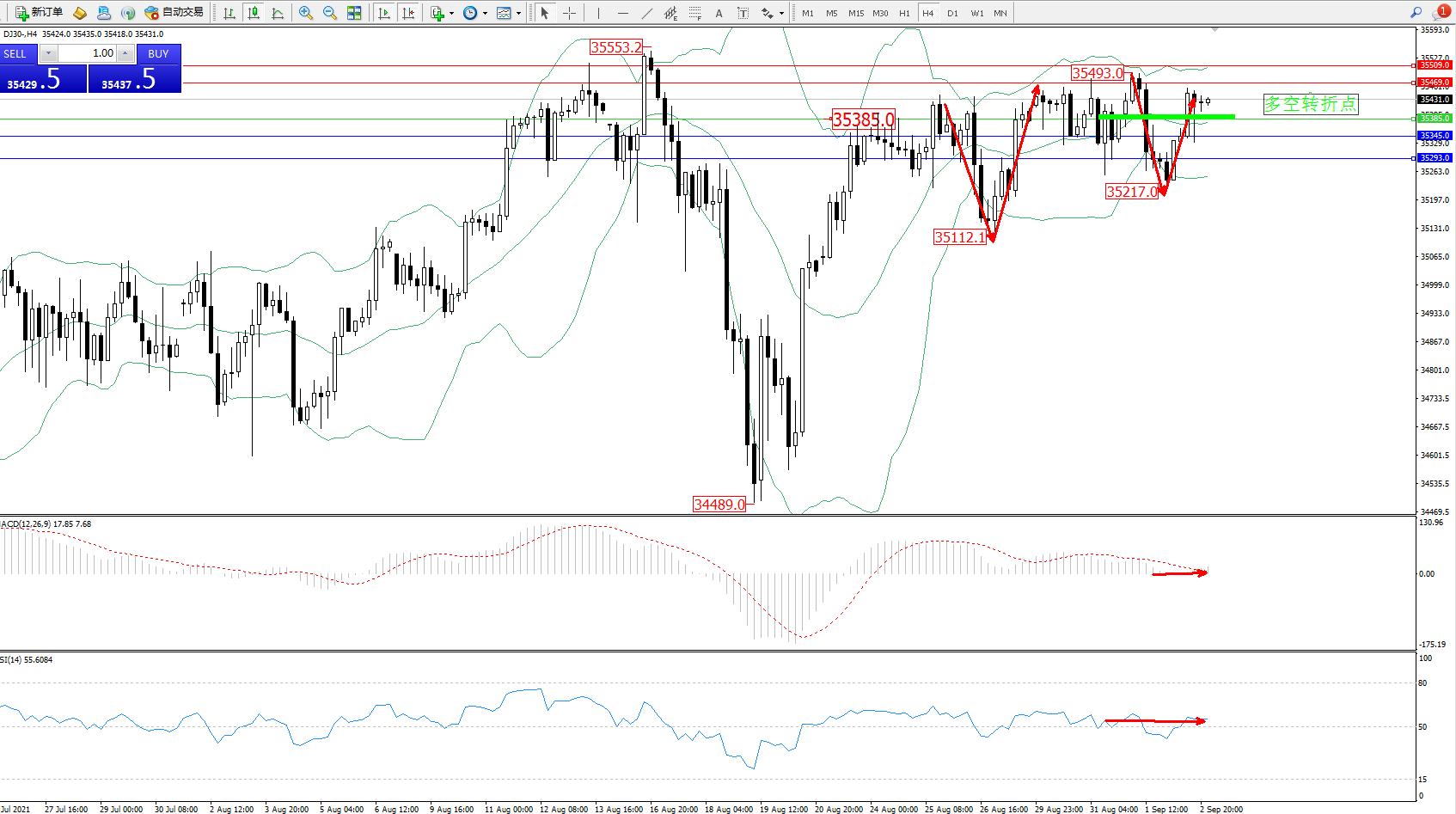 道琼斯指数DJ30——4小时K线图显示: