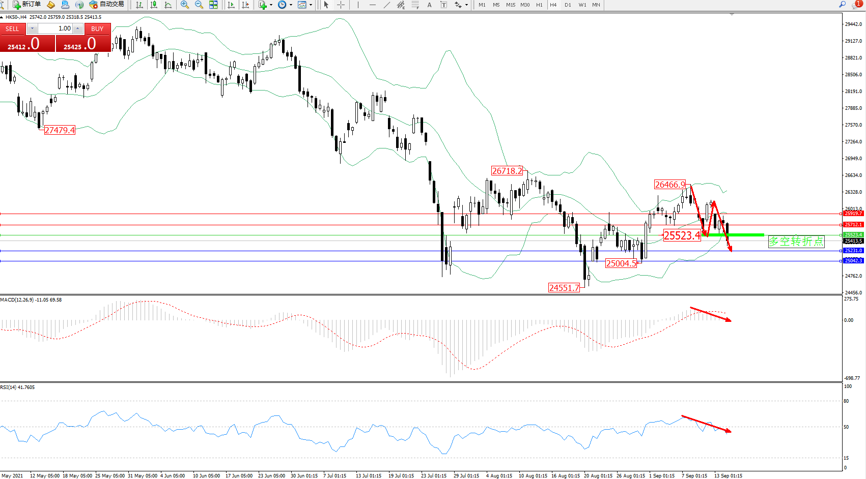 恒指HK50 ——4小时K线图显示: