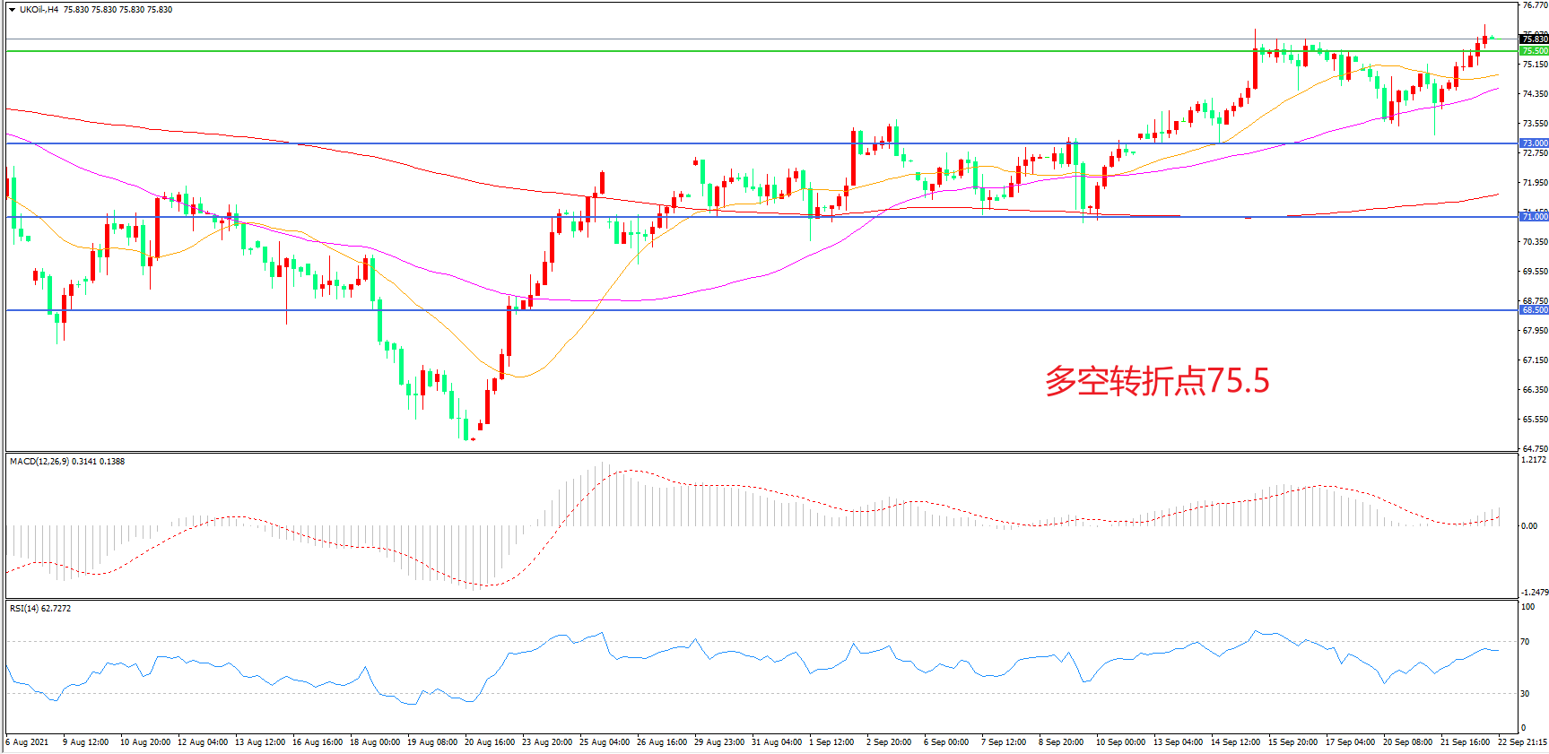 4小时图看,油价延续上行趋势,均线系统成为下方支撑,MACD红柱增加,RSI指标走平,日内震荡上行概率较大。
