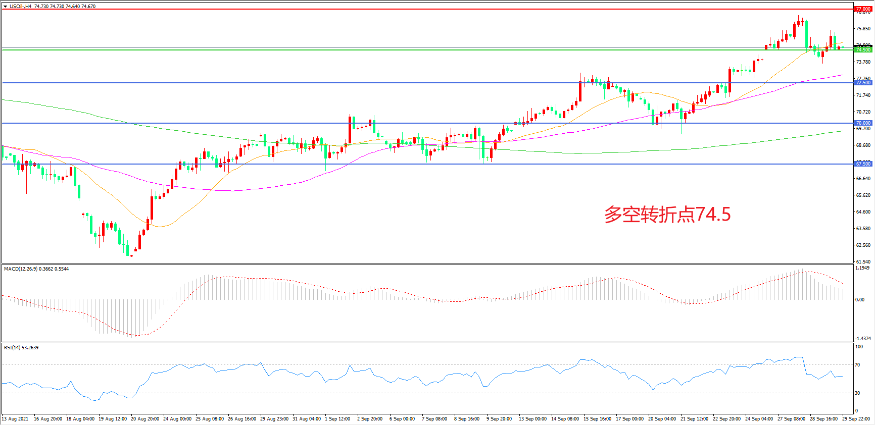 4小时图看,油价整体呈现冲高回落形态,74.5成为多空分水岭,均线系统呈多头排列,MACD红柱缩短,RSI指标走平,日内震荡上行概率较大。