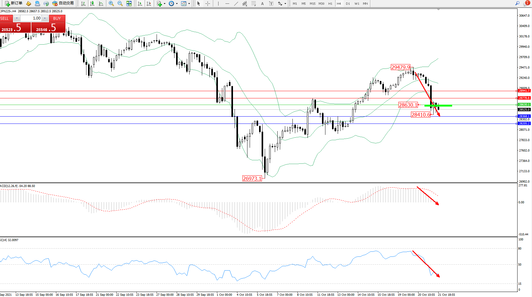 技术点评:多头动力延续布林带指标中上轨区间持续震荡上扬,高位抵达29479位置后遇阻急速回撤,抵达28410位置后开始短暂整理,空头动力有继续下行态势,布林带指标呈张口走势持续中,MACD指标处于多头区域维持整理下行,跌破0轴线后有继续下行迹象,RSI指标空头区域急速下挫至50均衡线下方不断整理中;