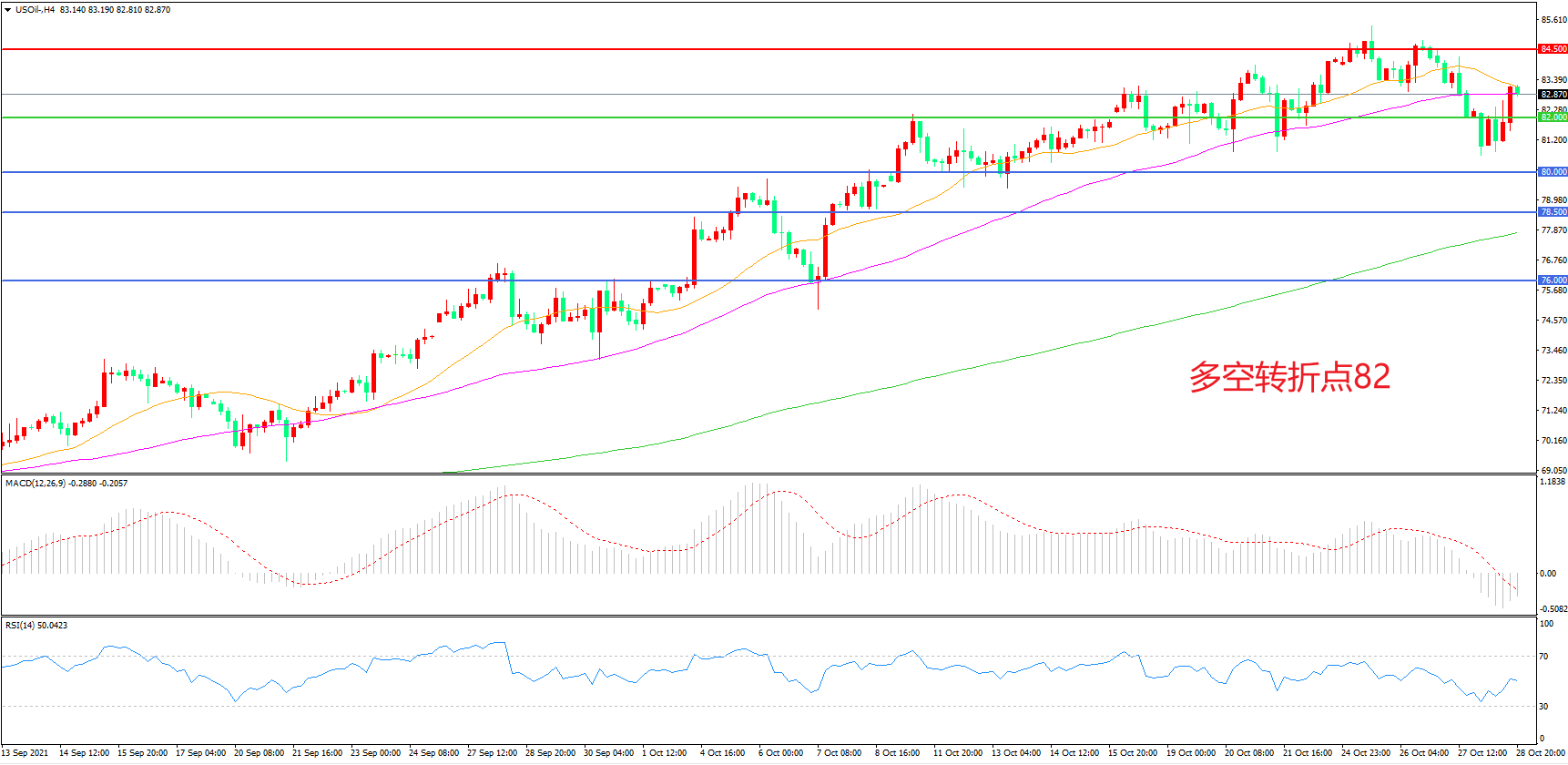 4小时图看,油价低位调整后再度拉升,整体表现偏强,84.5成为上方阻力,82成为下方支撑,MACD绿柱缩短,RSI指标走平,日内延续震荡概率较大。