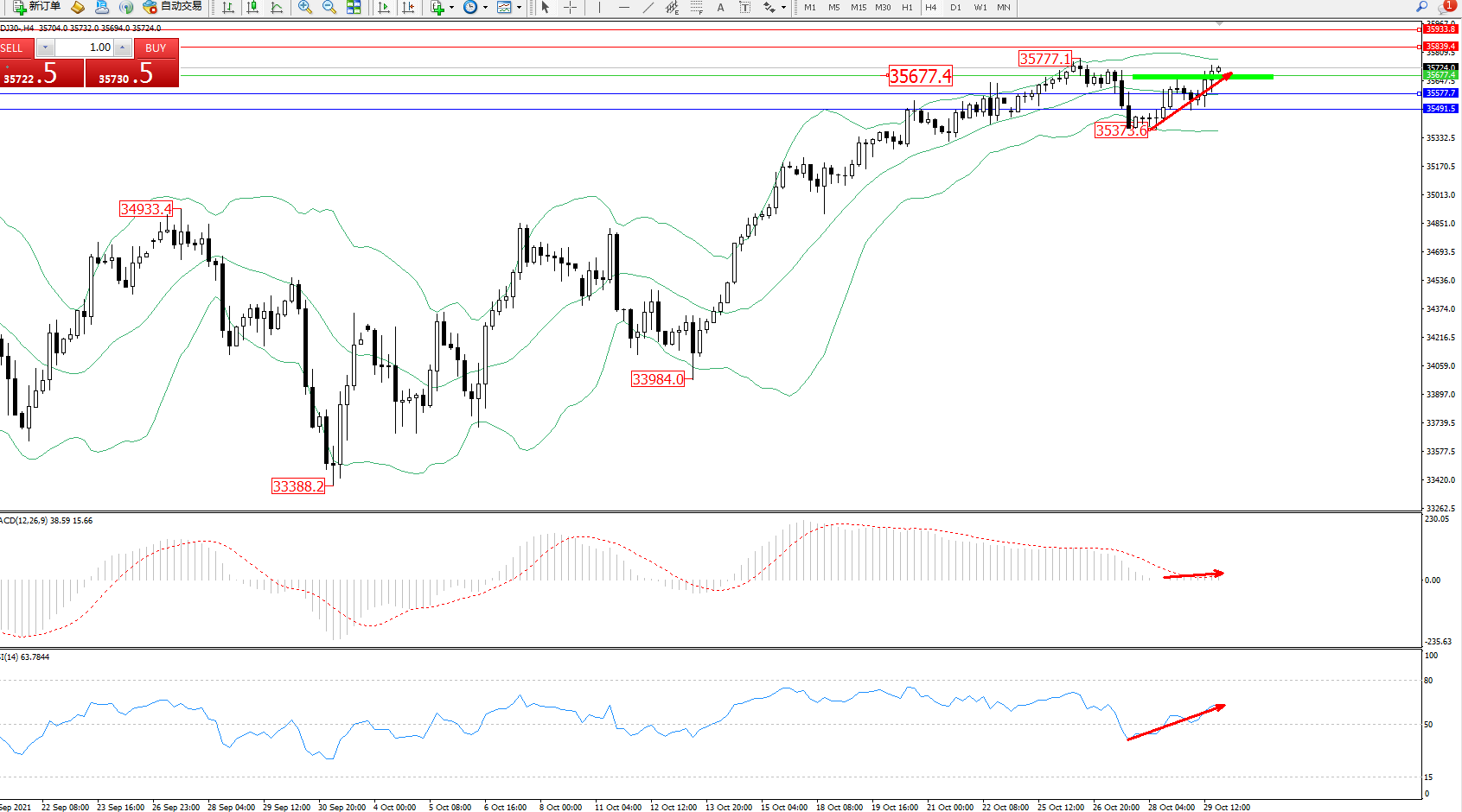 道琼斯指数DJ30——4小时K线图显示: