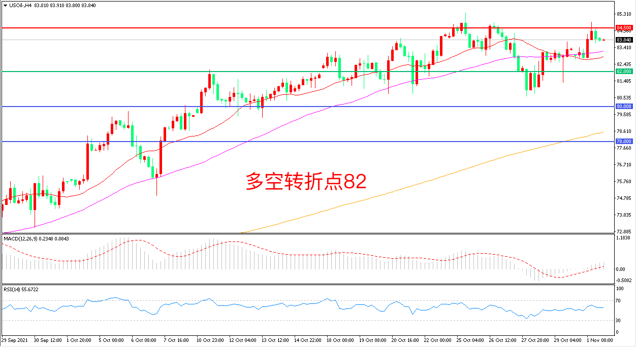 4小时图看,油价以均线系统为依托再度拉升,整体表现偏强,84.5成为短期阻力,82成为下方支撑,MACD红烛增加,RSI指标走平,日内震荡上行概率较大。