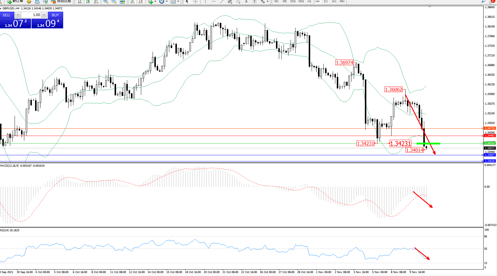 技术点评:空头动力延续布林带指标通道内持续宽幅震荡向下移动,短期虽有强势饭转上移,但整体下行趋势态势良好,且未见止步迹象,前期低位1.34231位置已然破位,布林带指标呈张口走势持续中,MACD指标处于空头区域维持整理持续下行,RSI指标处于震荡下行走势良好;