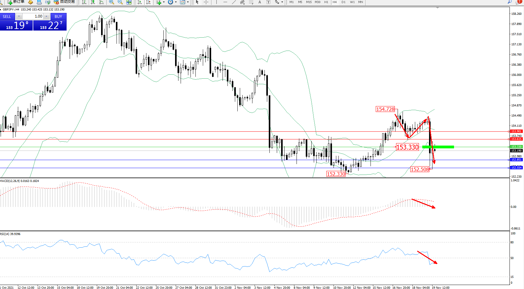 交易策略:153.330下方看跌,目标152.851、152.554