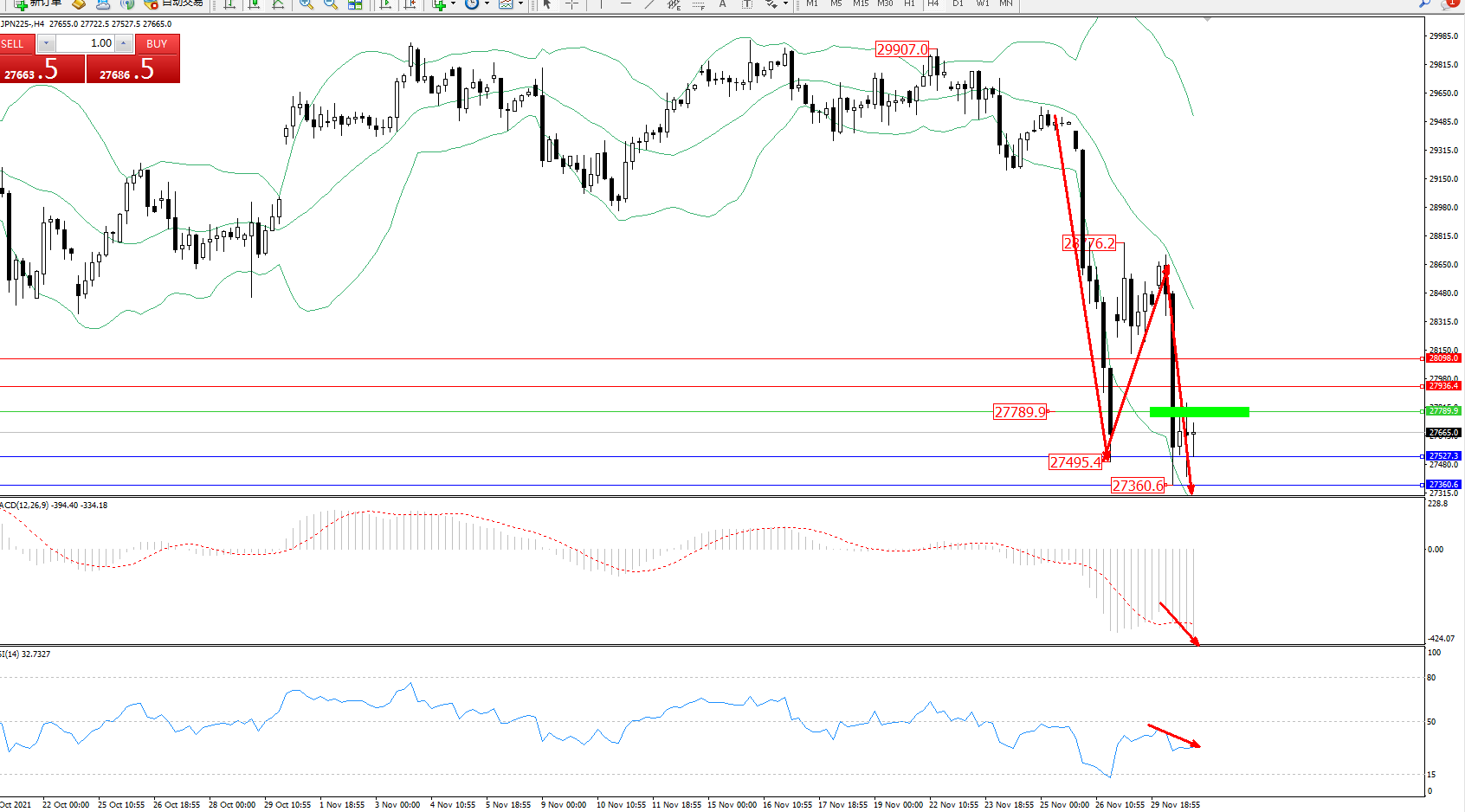 日经指数JPN225——4小时K线图显示: