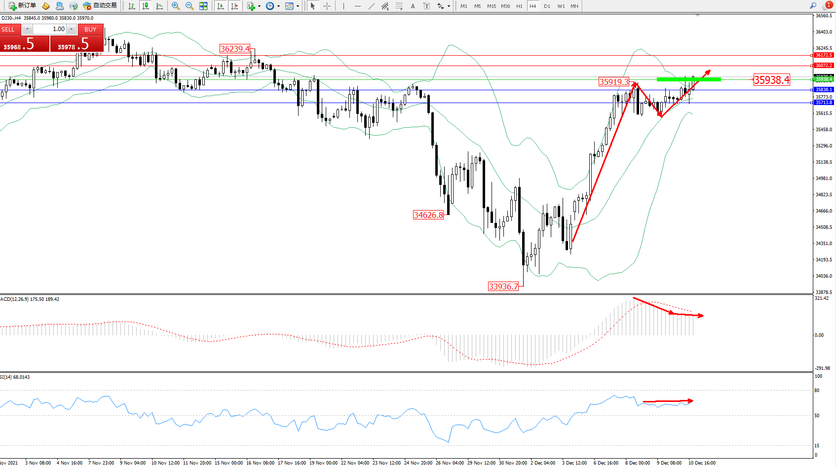 道琼斯指数DJ30——4小时K线图显示:
