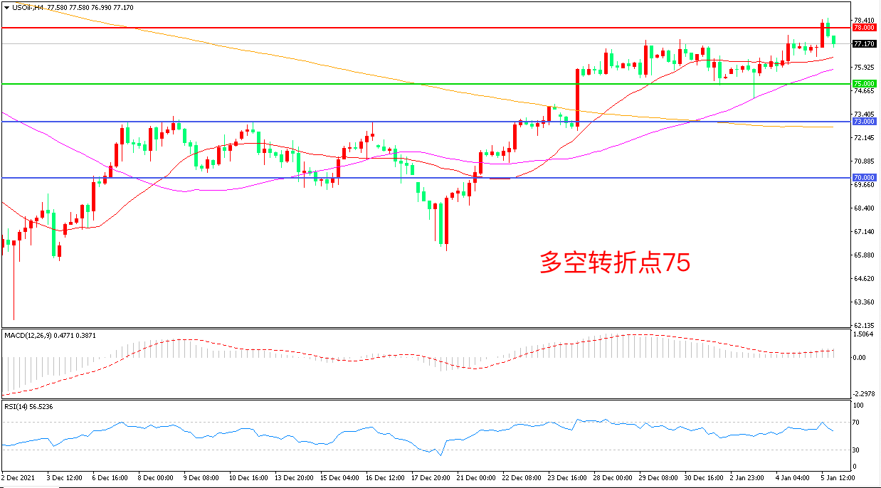 交易策略:在75.00之上看涨,目标77.50        80.00