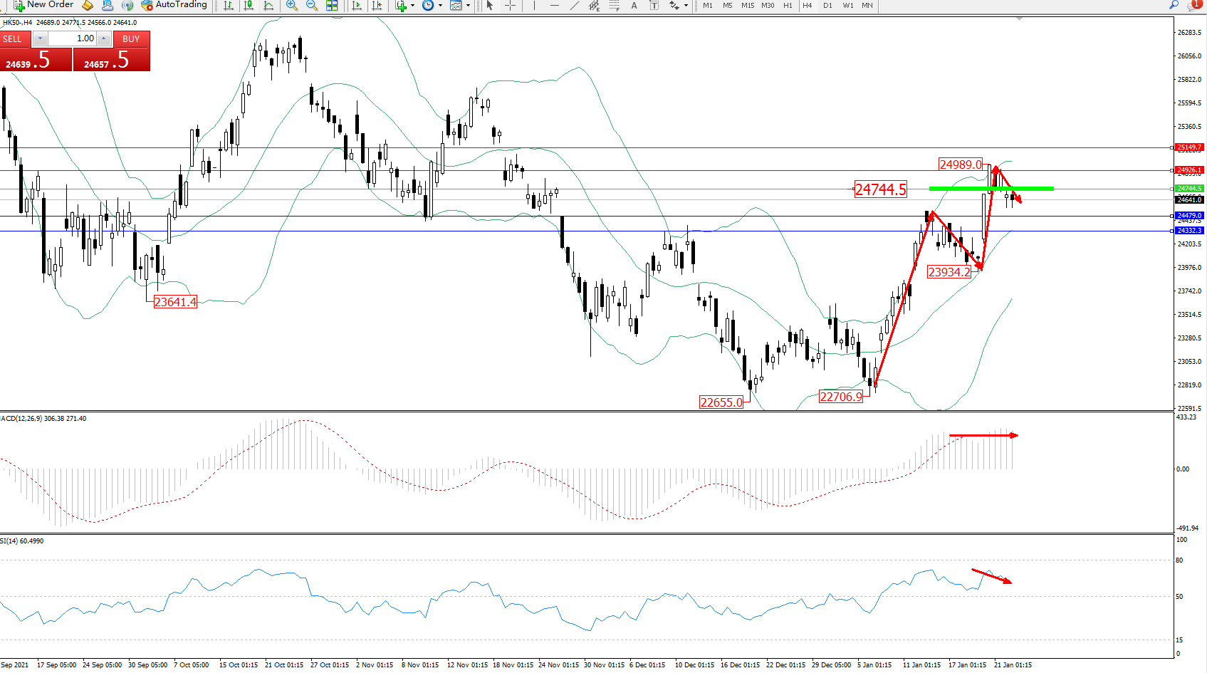恒指HK50 ——4小时K线图显示: