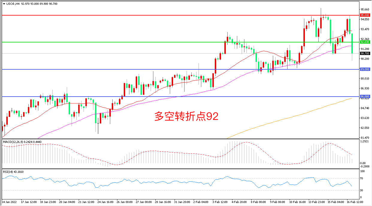 周三(2月16日),美国EIA原油库存意外增加112.1万桶传递出需求下降的信号,伊核谈判协议达成的前景乐观造成多头“夺路而逃”, 美国WTI原油大幅下挫,收报90.59美元/桶。短期内乌克兰危机如果不再激化,油价的超买修正需求或许导致进一步下跌。