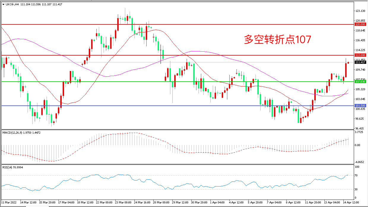 4小时图看,油价长阳拉升突破前期阻力,短期走势偏强,107美元成为下方支撑,MACD红柱增加,RSI指标走平,日内震荡上行概率较大。