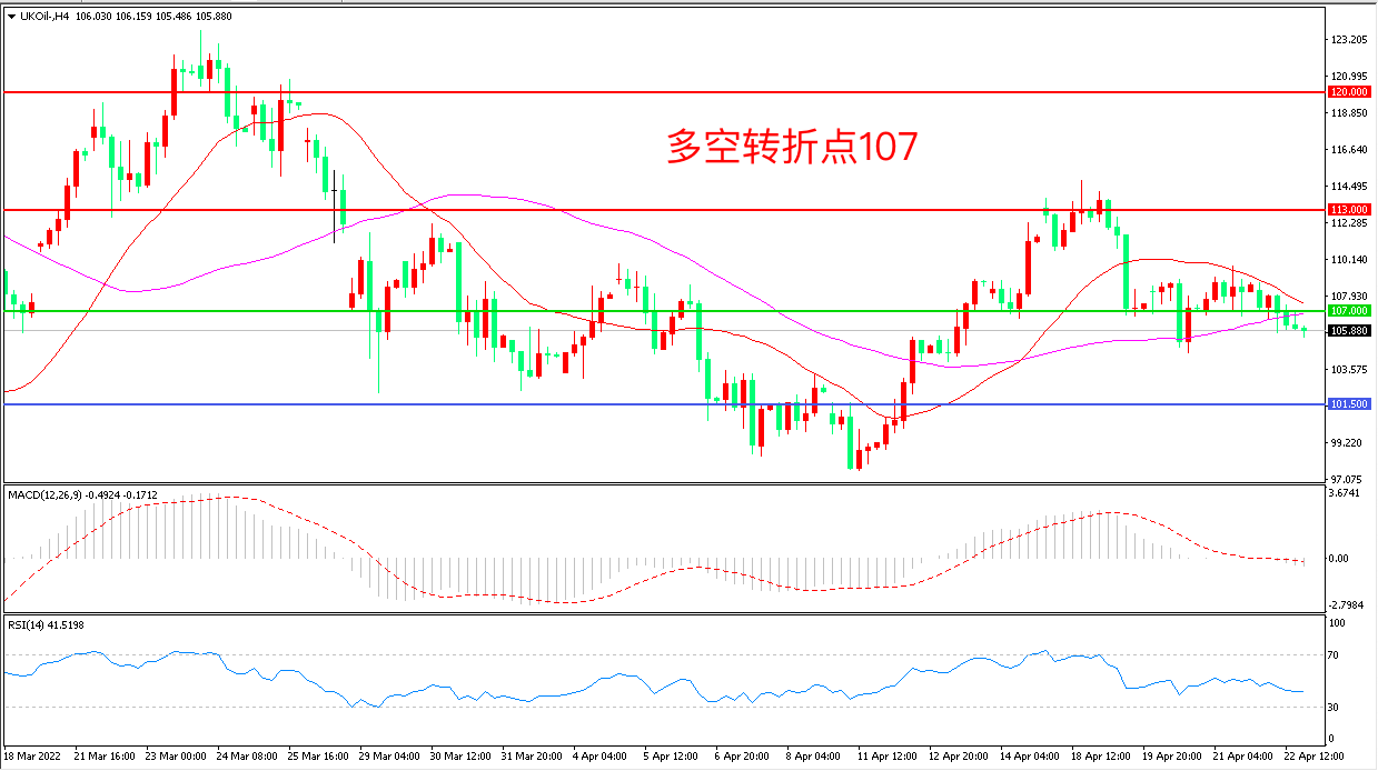 4小时图看,油价触碰107阻力后再度回落,上行动力略显不足,MACD红柱缩短,RSI指标走平,日内延续震荡概率较大。