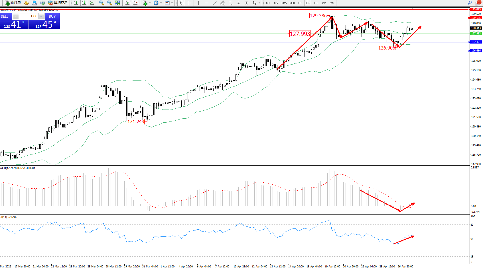 备选策略:127.993下方看跌,目标127.321、126.666