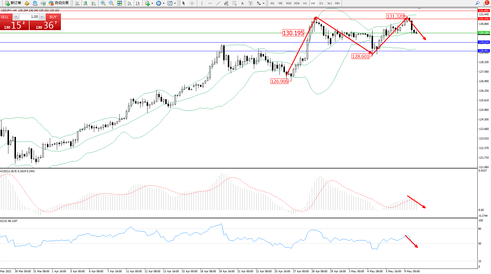 交易策略:130.195下方看跌,目标129.534、128.951