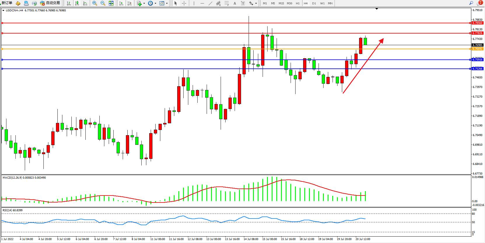 交易策略:6.76692上方看涨,目标6.77826、6.78560