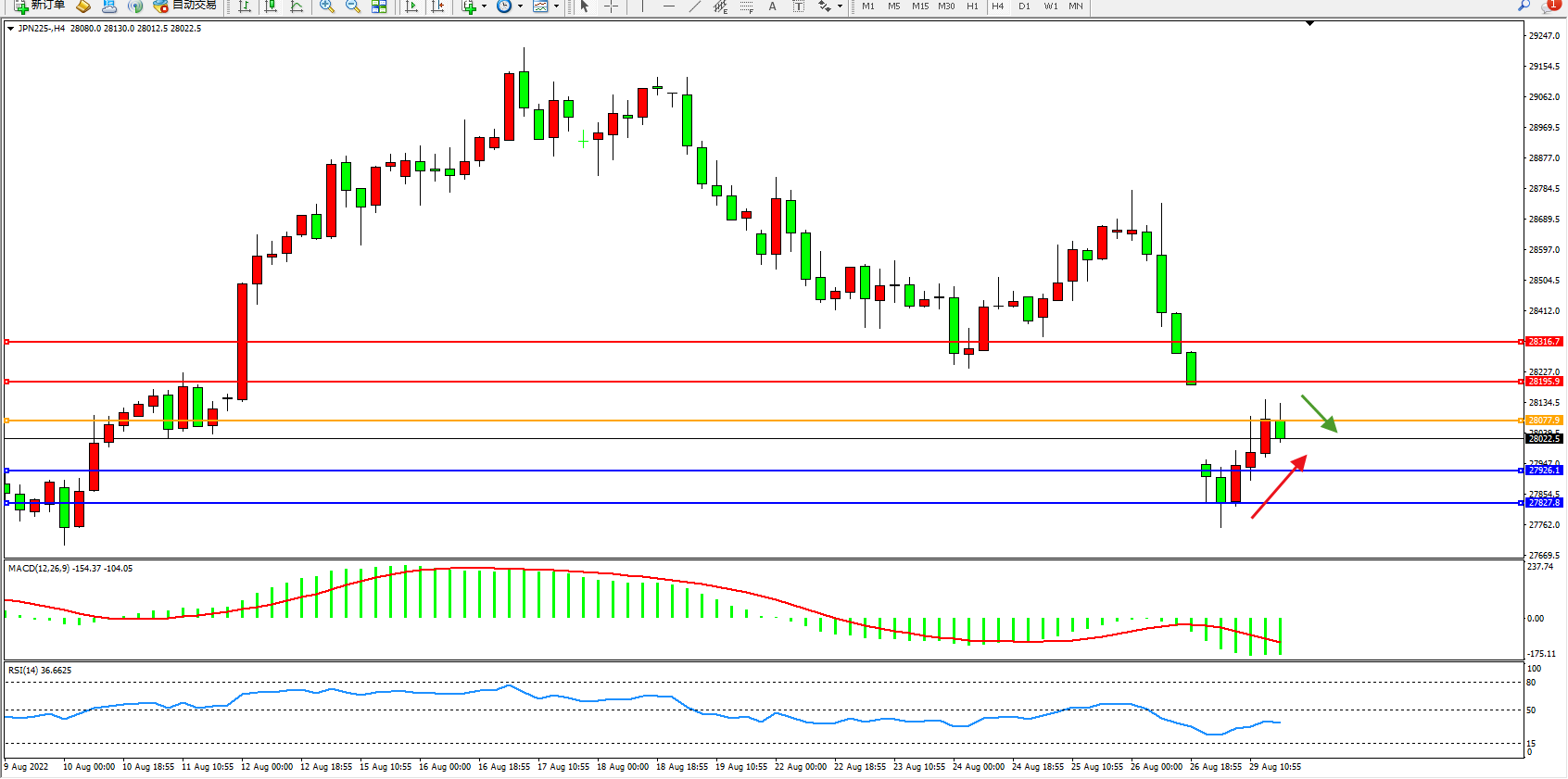 日经指数JPN225——4小时K线图显示: