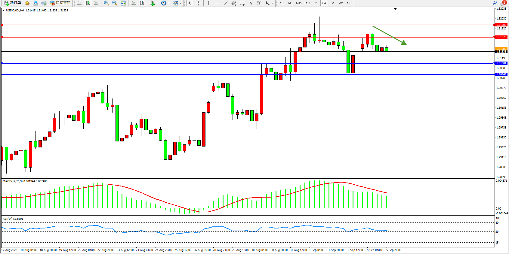 美元加元USDCAD——4小时K线图显示:
