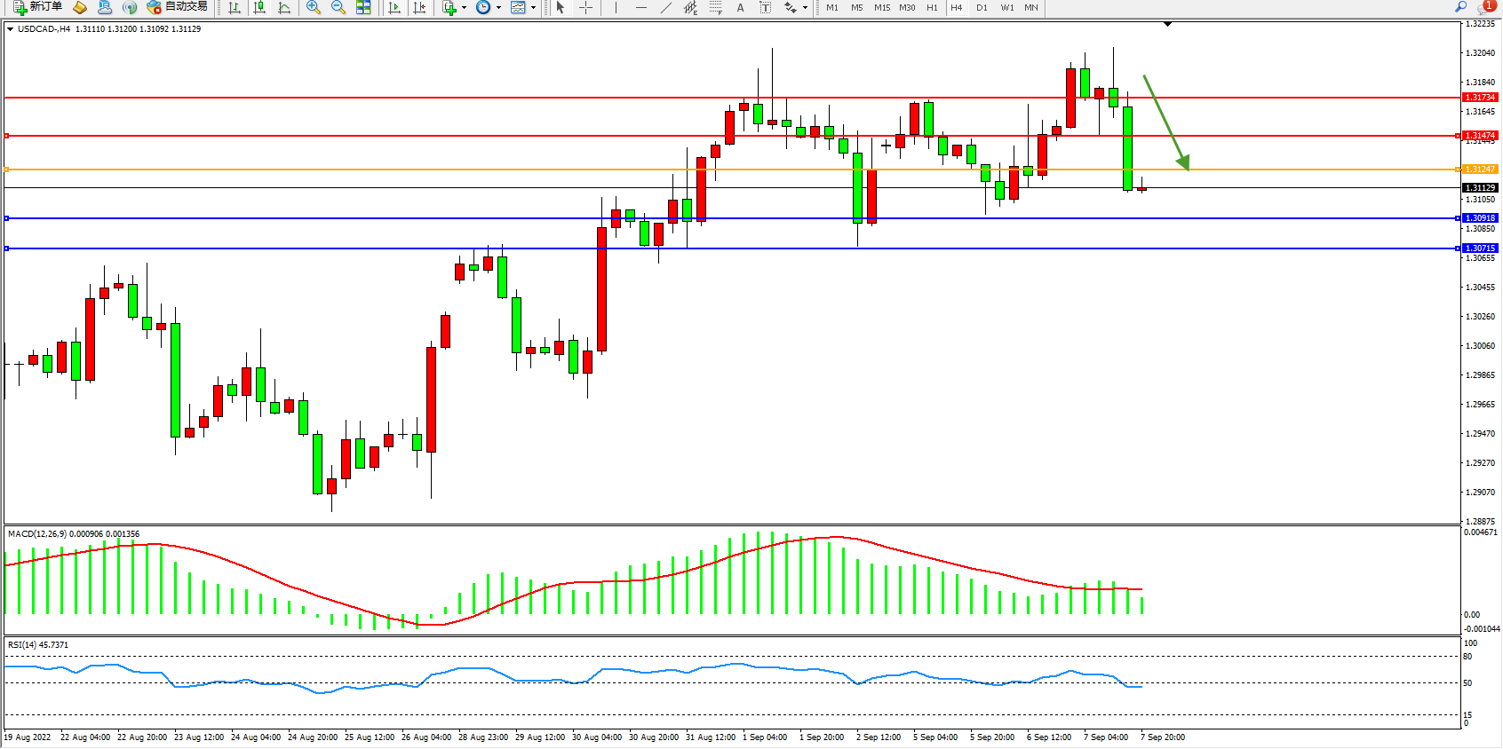美元加元USDCAD——4小时K线图显示: