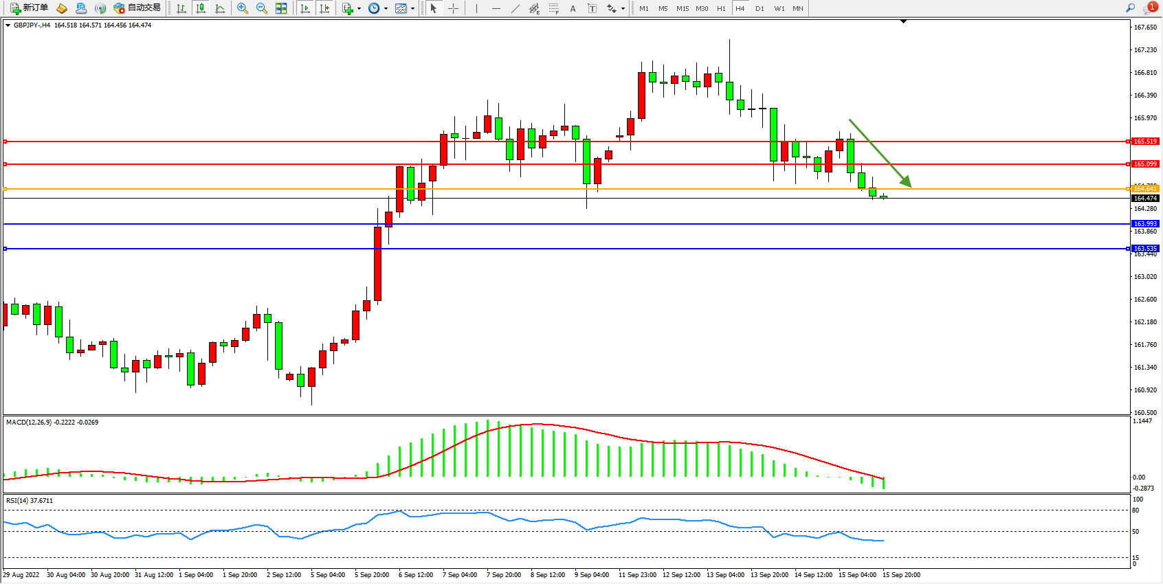 备选策略:164.641上方看涨,目标165.099、164.519