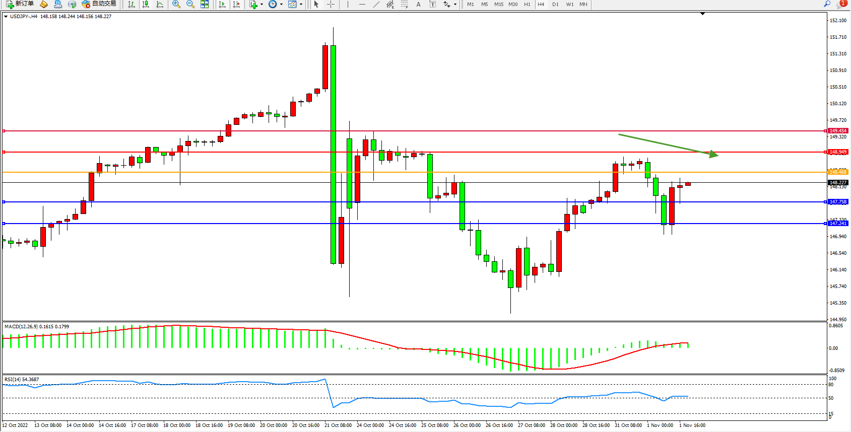 交易策略:148.468下方看跌,目标147.758、147.241