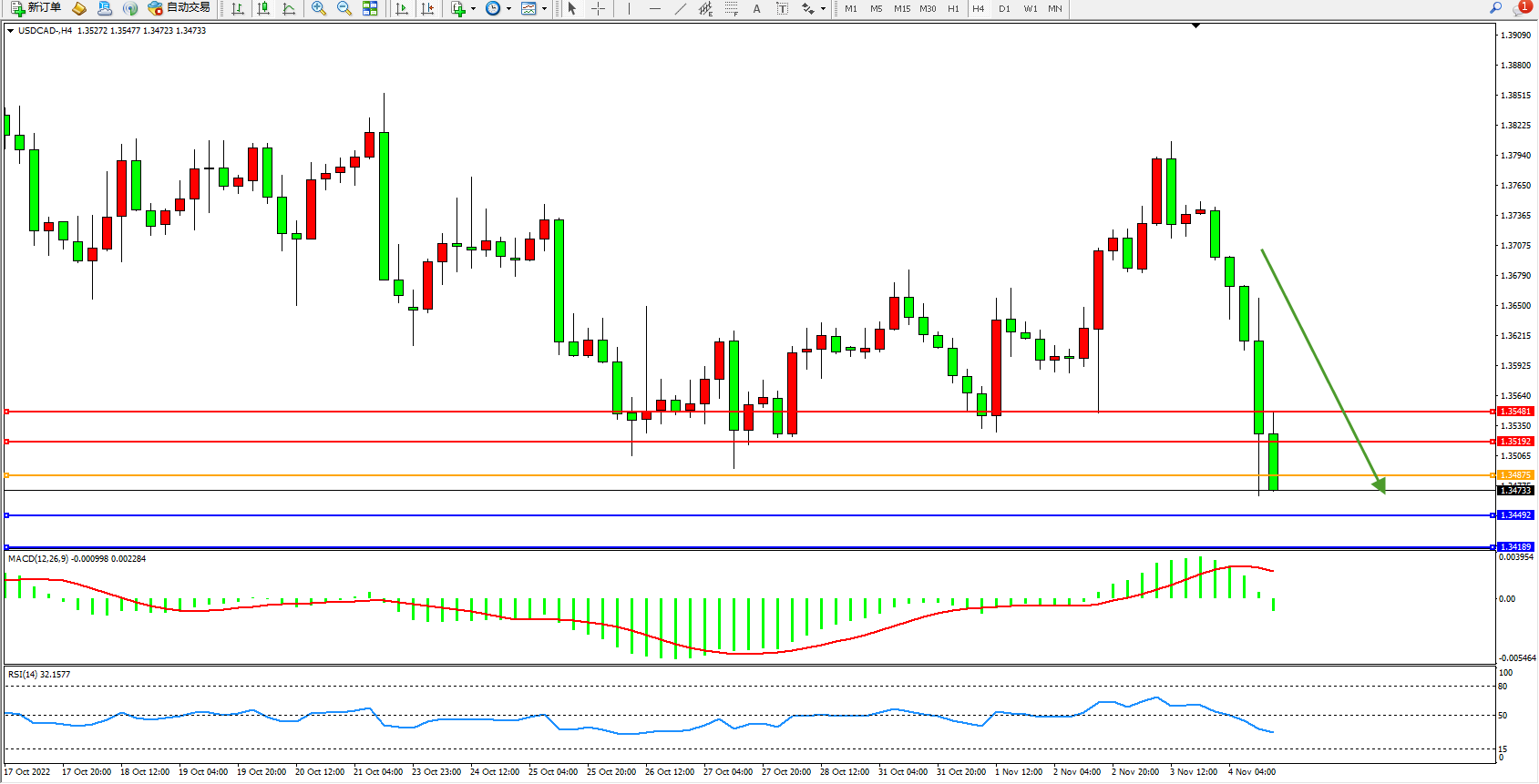 4小时图看:市场空头动力急速下挫,短期跌势未见止步,市场空头情绪态势良好,有进一步向下移动态势,MACD指标处于0轴线下侧整理,RSI指标处于50均衡线下侧不断下行;