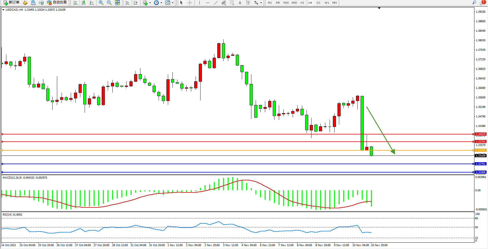 美元加元USDCAD——4小时K线图显示: