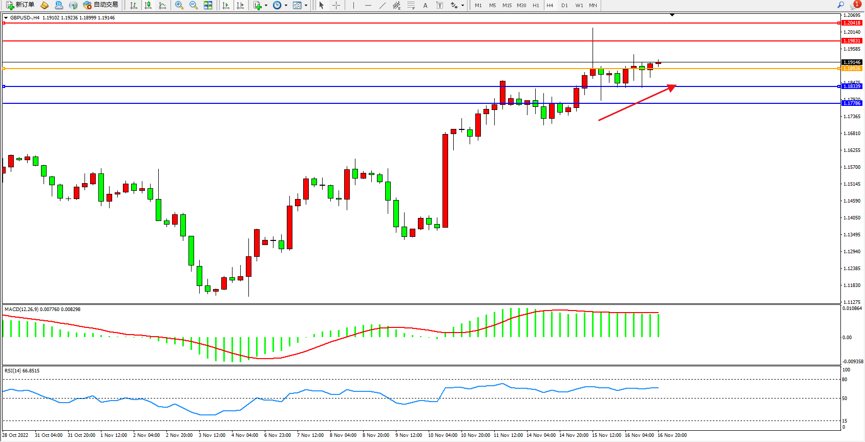 英镑兑美元维持1.19144附近震荡, 英国10月CPI年率 11.1%,预期10.70%,创历史新高。英国10月零售物价指数月率录得2.4%,为2022年4月以来最大增幅。