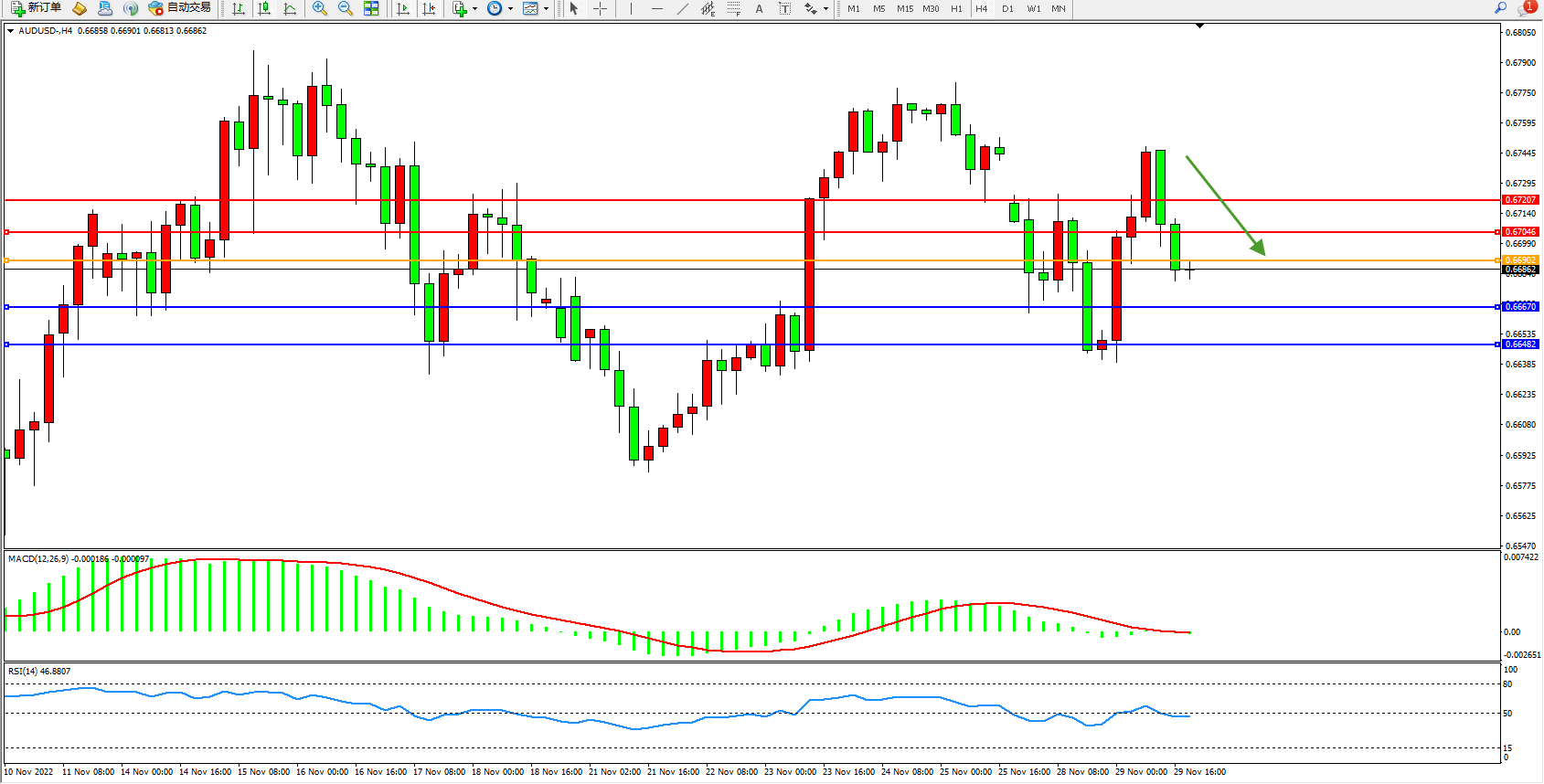 交易策略:0.66902下方看跌,目标0.66670、0.66482