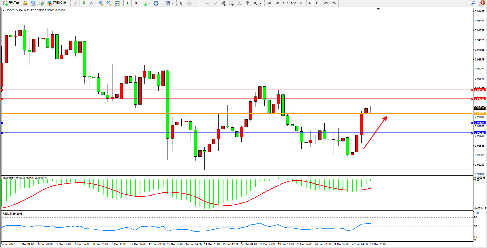 交易策略:0.93033上方看涨,目标0.93261、0.93400