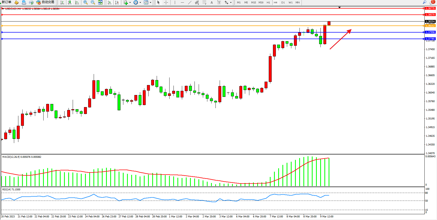 美元加元USDCAD——4小时K线图显示: