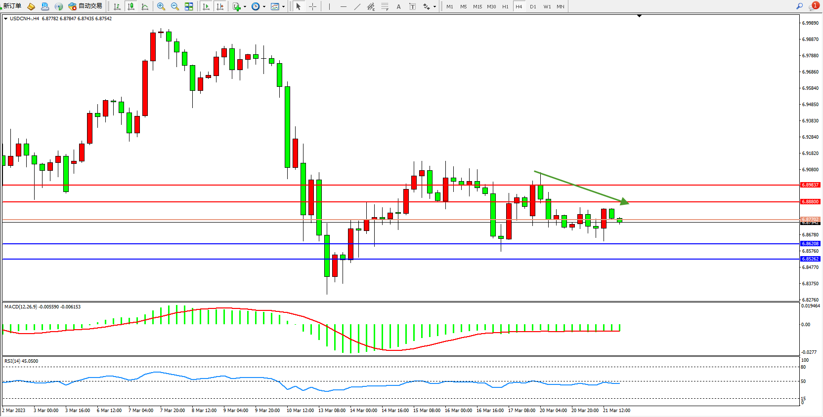 交易策略:6.87702下方看跌,目标6.86208 6.85262