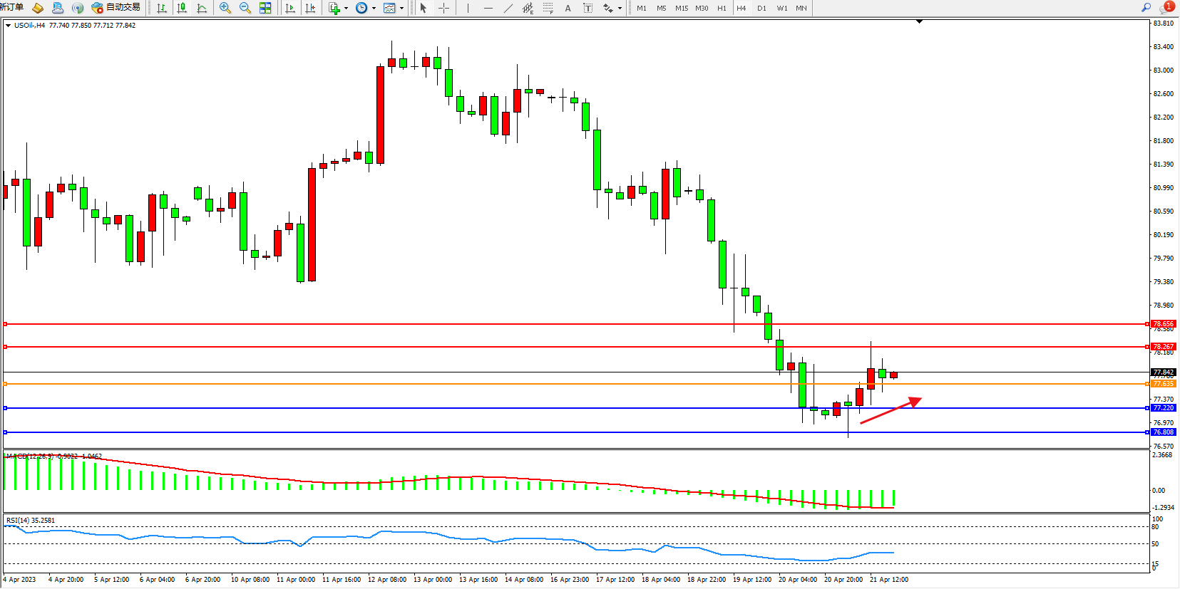 交易策略:77.635上方看涨,目标78.267 78.686