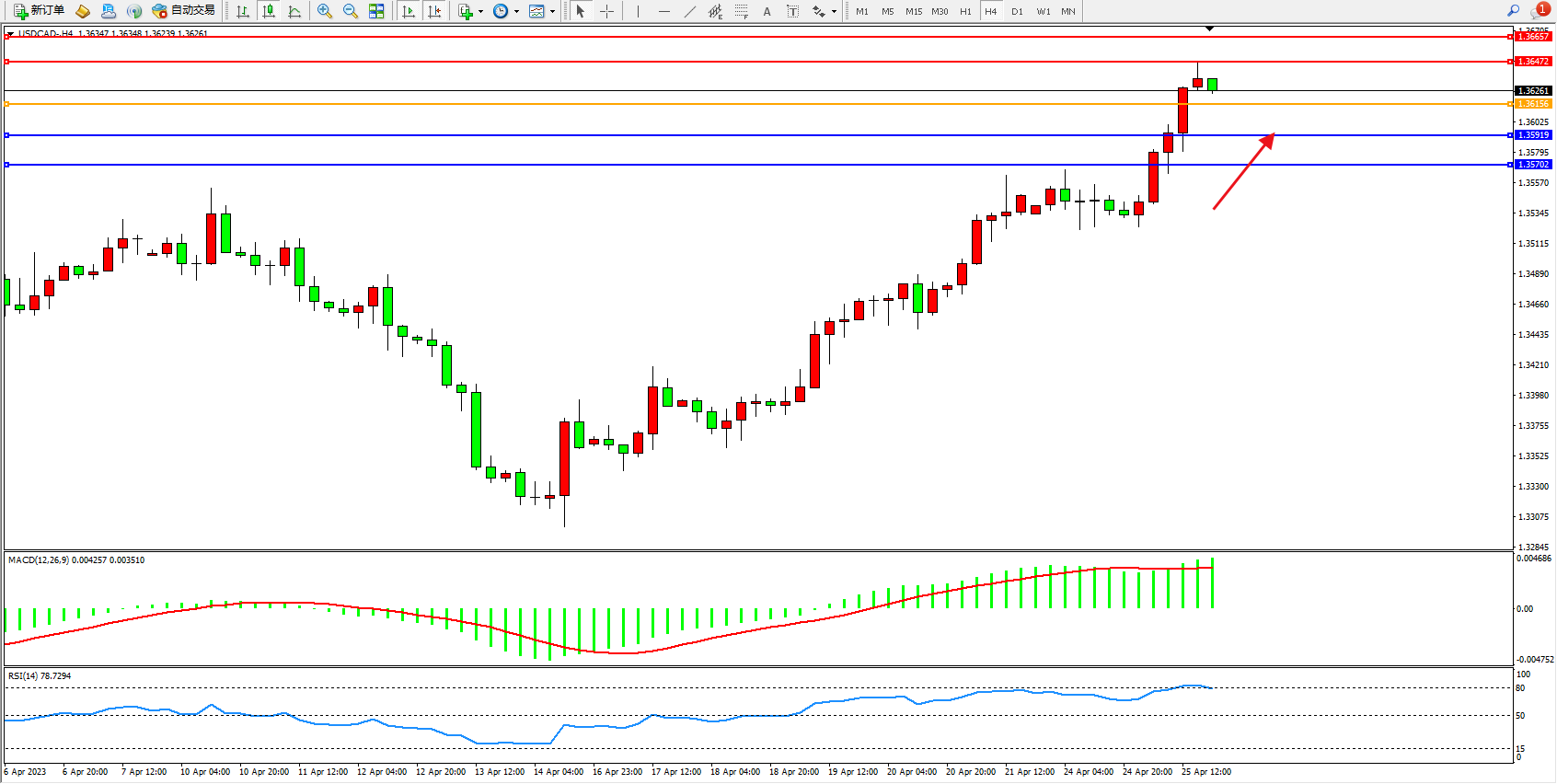 美元加元USDCAD——4小时K线图显示: