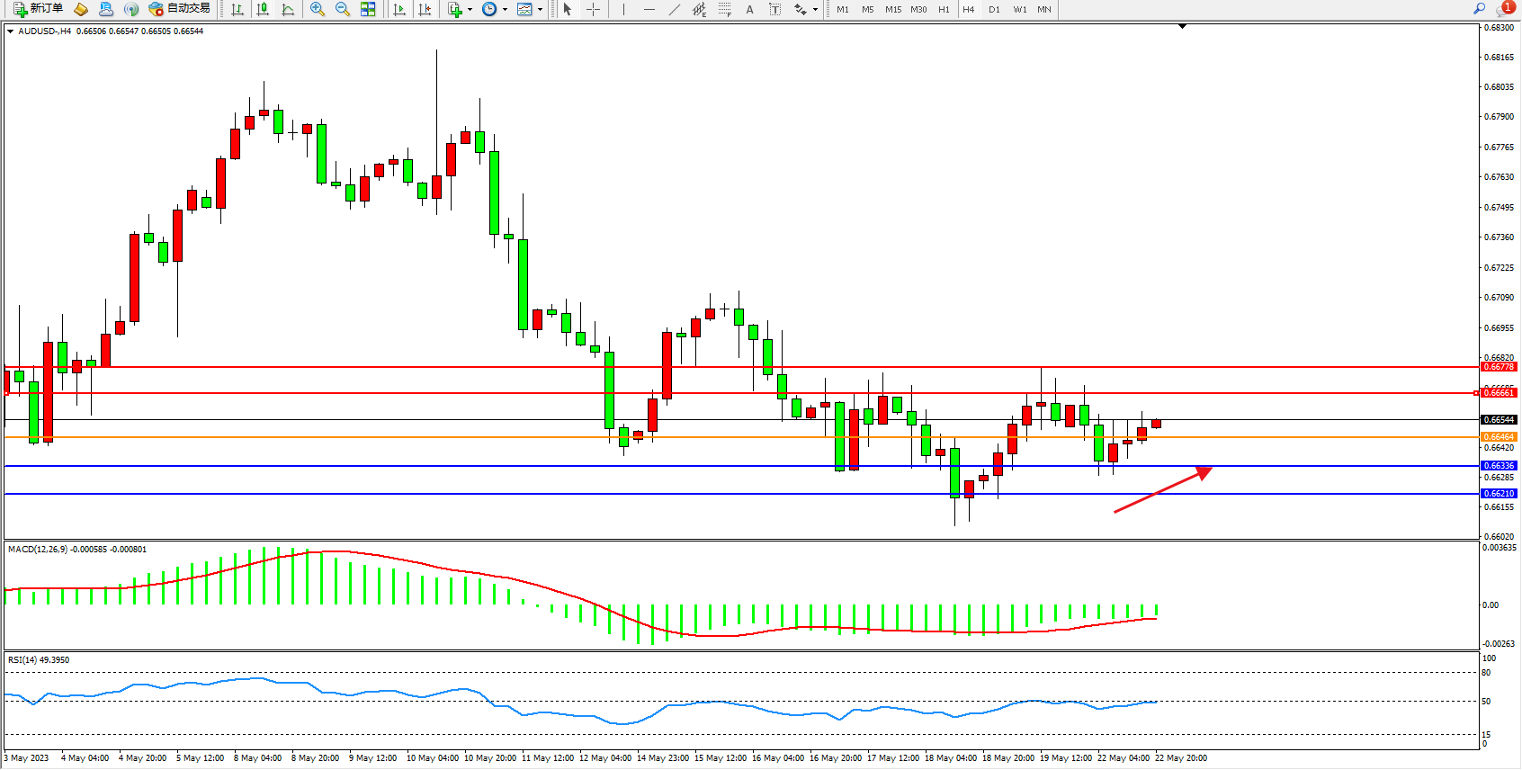 交易策略:0.66464上方看涨,目标0.66661 0.66778