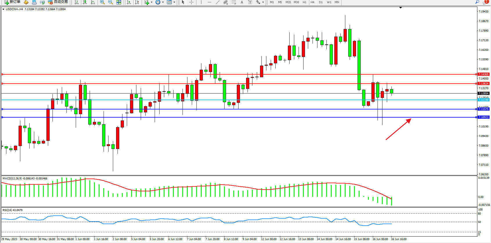 美元人民币USDCNH——4小时K线图显示:
